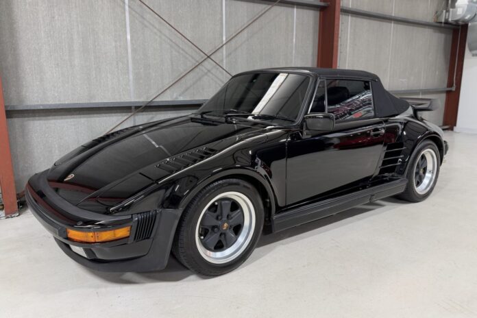 This 1987 Porsche 911 Turbo cabriolet left the factory with M505 slant-nose bodywork and now shows 27k miles. Finished in black over black leather, the car is powered by a turbocharged 3.3-liter flat-six paired with a four-speed manual transaxle. Features include the Sport Touring Package as well as an Armytrix valved exhaust system, disc brakes, 16″ Fuchs alloy wheels, a front lip spoiler, pop-up headlights, a power-operated black soft top, a tea-tray rear spoiler, heated power-adjustable front seats, air conditioning, power windows, and a Blaupunkt cassette stereo. Nearly $20k in service invoices since 2024 can be viewed in the gallery. Acquired by the selling dealer in 2026, this M505 930 Turbo cabriolet is offered in Ohio with a Porsche Certificate of Authenticity, an owner’s manual, tool and tire inflation kits, service records, a clean Carfax report, and a clean Montana title.