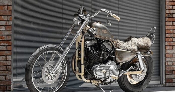 The builder: 2LOUD Custom. The client: Yellow黃宣. The brief: A Sportster Chopper with a faux fur seat.