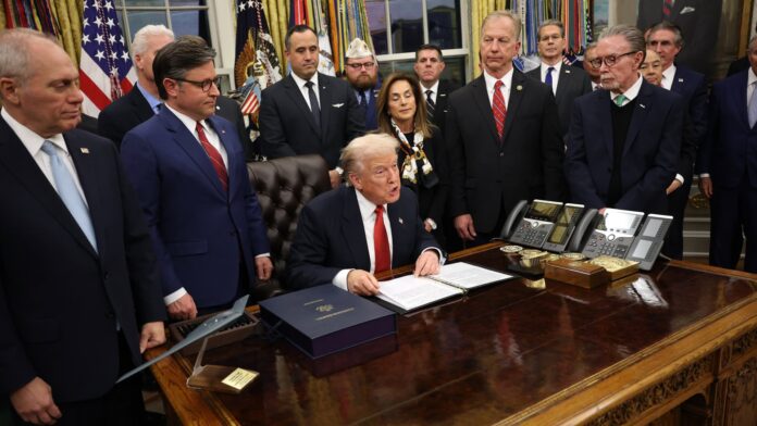 U.S. President Donald Trump signs funding legislation to reopen the federal government as he is joined by House Speaker Mike Johnson (R-LA), House Minority Leader Steve Scalise (R-LA), Republican lawmakers and business leaders, during a ceremony in the Oval Office of the White House on Nov. 12, 2025, in Washington, DC.