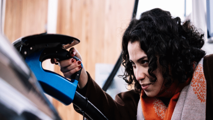 Getty Images Woman with dark hair plugs in electric vehicle to charging pointGetty Images